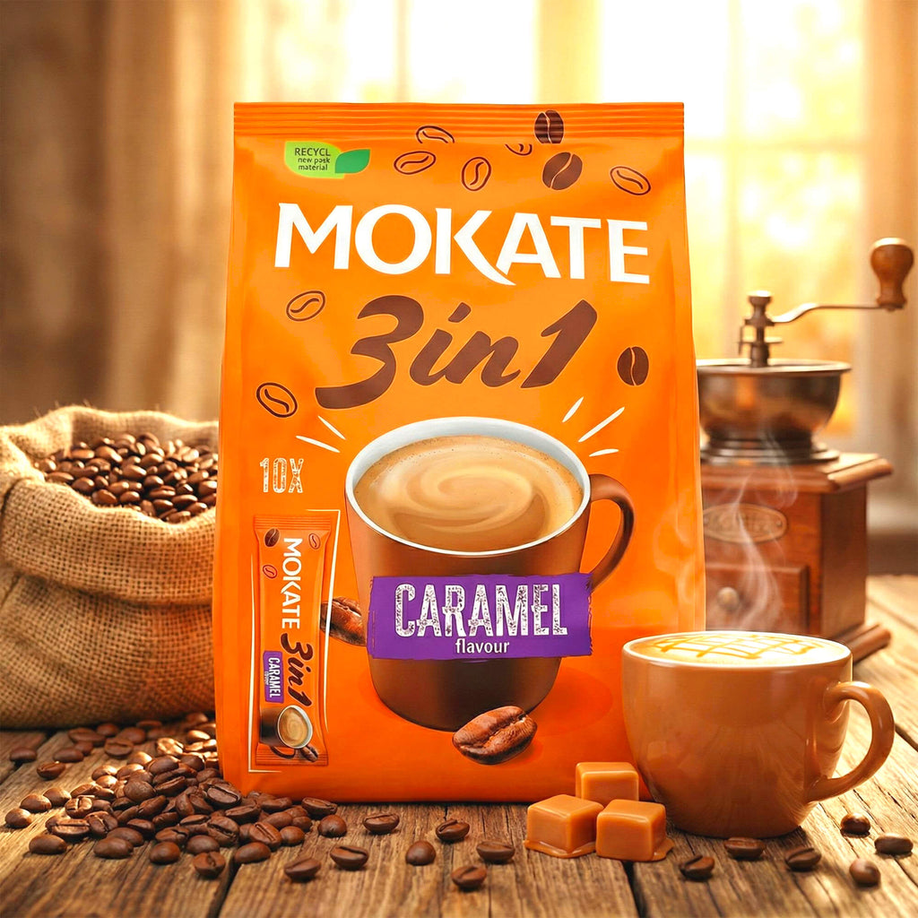 • Gönn dir eine kleine Auszeit mit den Mokate Kaffee Sticks 3 in 1 Karamell – dein süßer Moment des Tages!